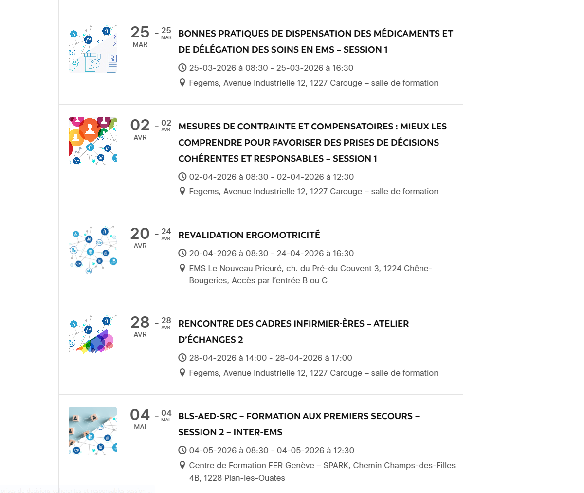 Nous sommes également actifs en formations continues ciblées pour le personnel en EMS, dont tout ce que propose la Fegems et les HUG pour les soins, ce qui est gage de qualité.