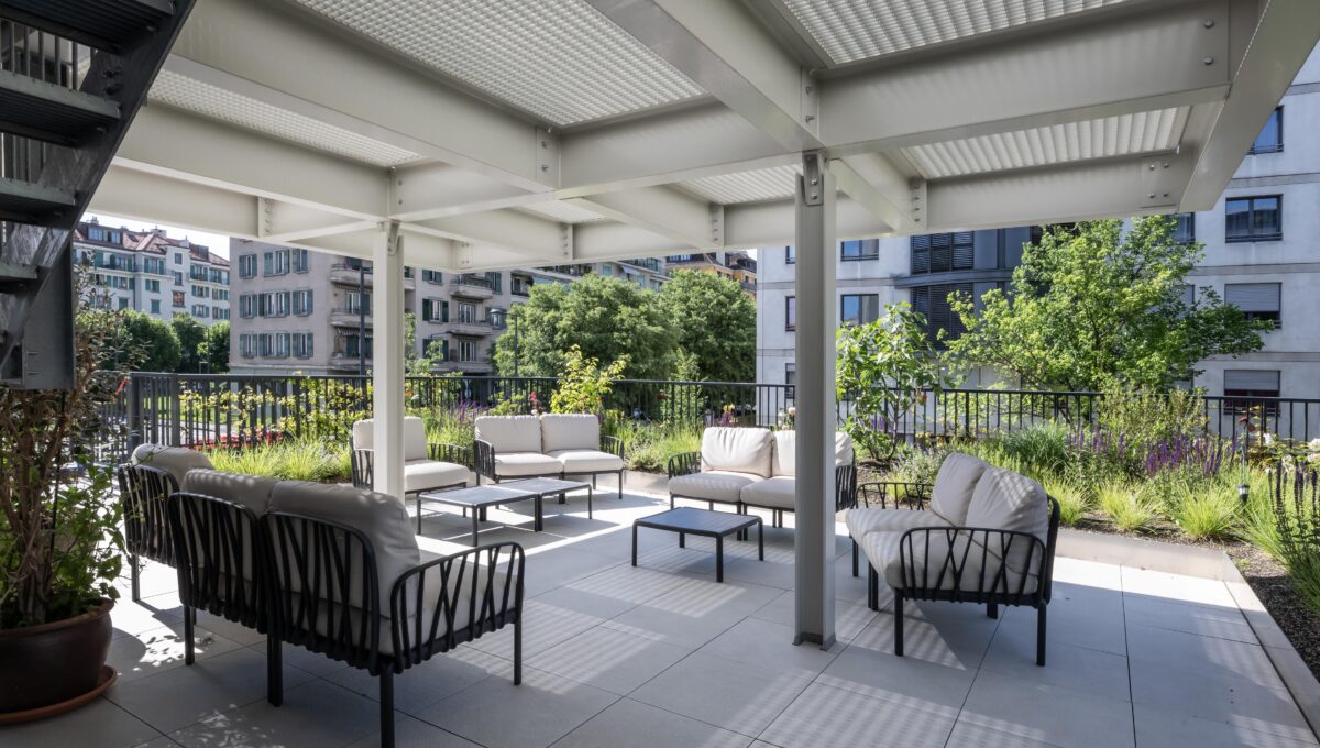 La nouvelle terrasse du premier se présente comme un jardin urbain au calme, idéal pour le repos. On y accède depuis l’intérieur, où nous avons créé un nouvel espace commun aux résidants et au public. C’est un autre lieu de mixité qui se situe au même étage que la salle du personnel, ce qui favorise les échanges.