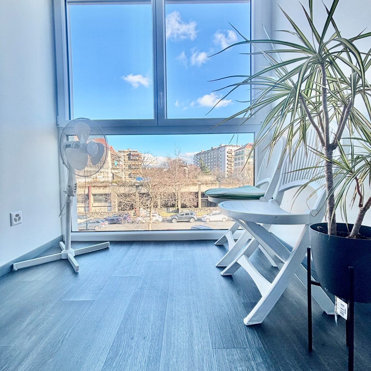 Le 7ème étage est le plus calme. Il y a une salle de conférence et six chambres un peu différentes, mansardées, avec le désavantage que les balcon ne sont pas transparents comme les loggias plus bas, il faut être debout pour voir la vue. Mais celle-ci est magnifique : on voit le jet d’eau et la cathédrale.